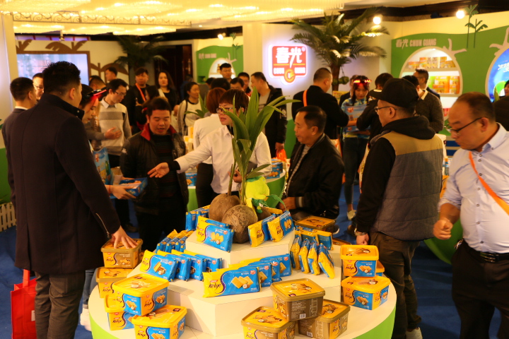 在本届糖酒会上,春光食品携旗下新品可丽思系列饼干——椰子千层酥、椰子蝴蝶酥、椰子曲奇、椰子巧克力曲奇、椰子巴旦木曲奇以及菠萝蜜果干、菠萝蜜初果干、香蕉干、原味椰子脆片、芒果味椰子脆片、椰子味爆浆果心球、芒果味爆浆果心球等具有海南特色风味的休闲食品参展,阵容强大、产品众多,赢得了现场观众、经销商和采购商们的一致好评。