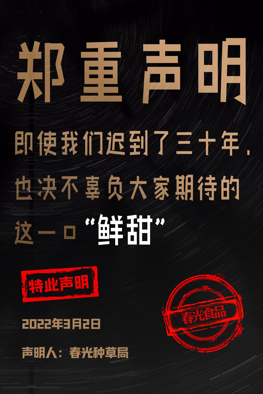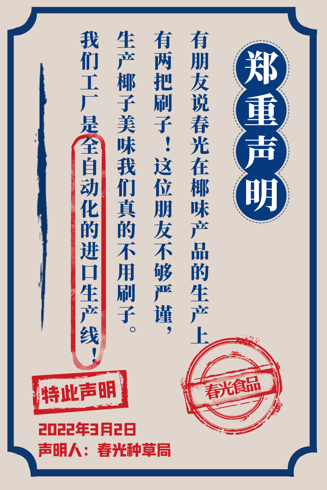 在新品官宣期间,春光食品连发26条新品声明,用简单粗暴又不失趣味性的文案高效传递了品牌态度与产品卖点,在大量地围观和传播扩散之下,声明文案成功地吸引了广大网友的注意力。据了解,接下来春光食品还将开办线下品鉴会快闪店、围绕产品设计ip卡通等一系列年轻化动作。