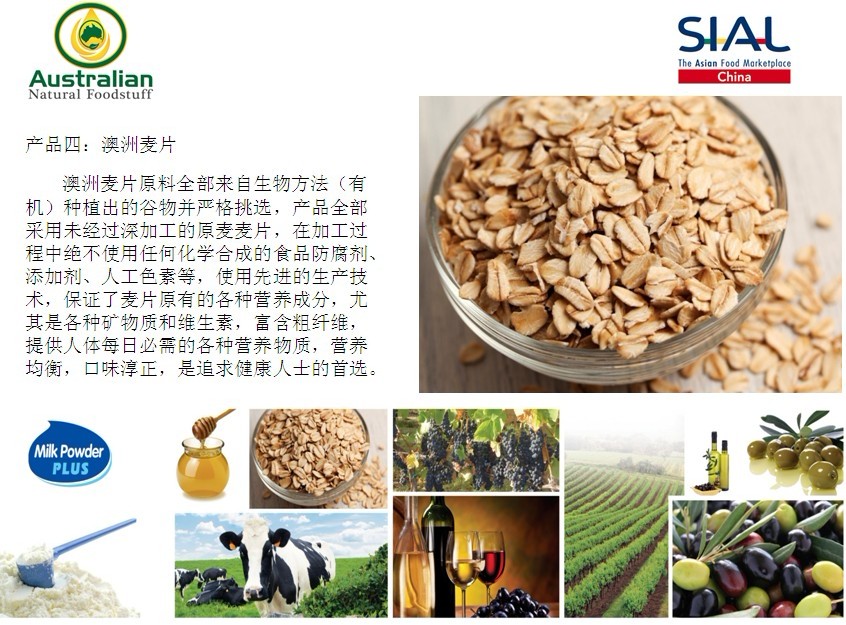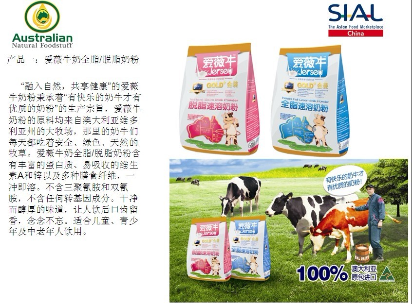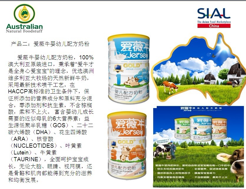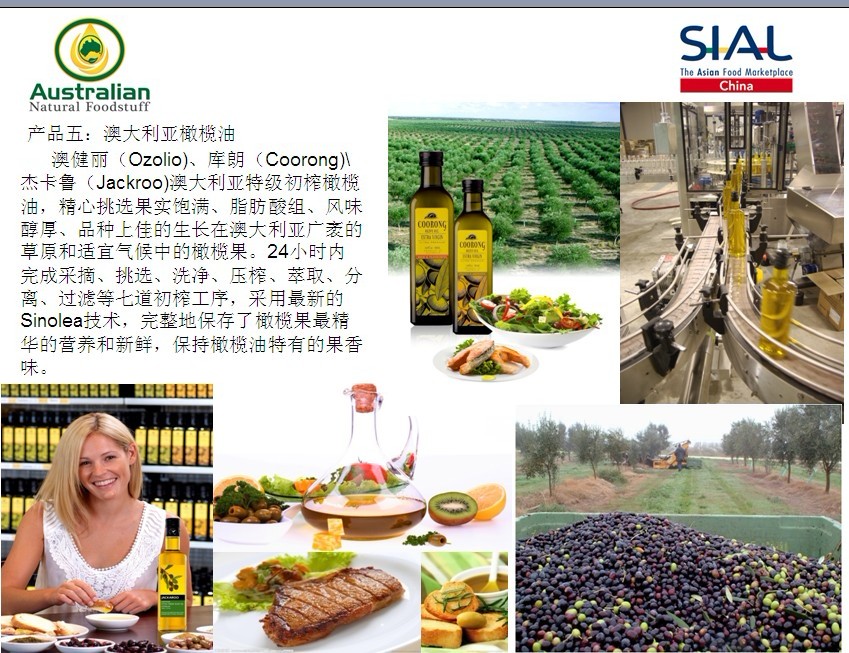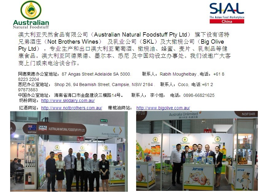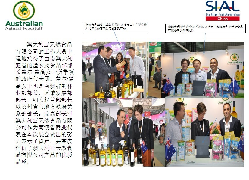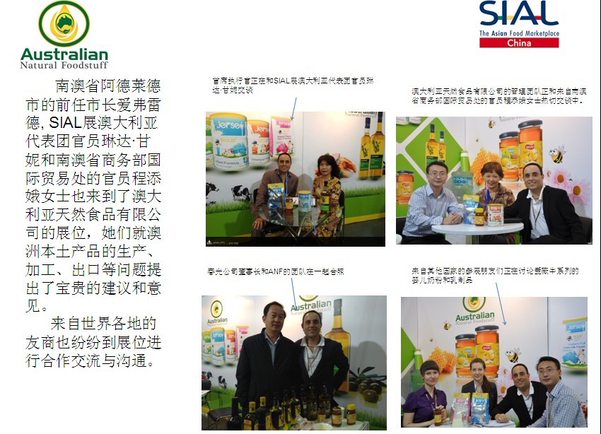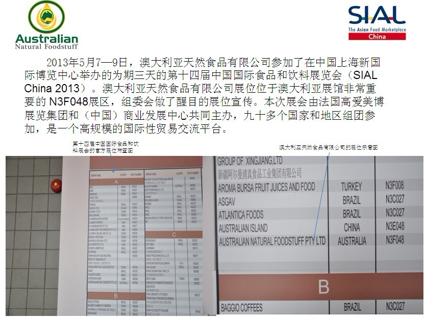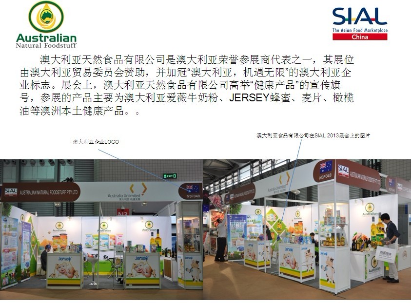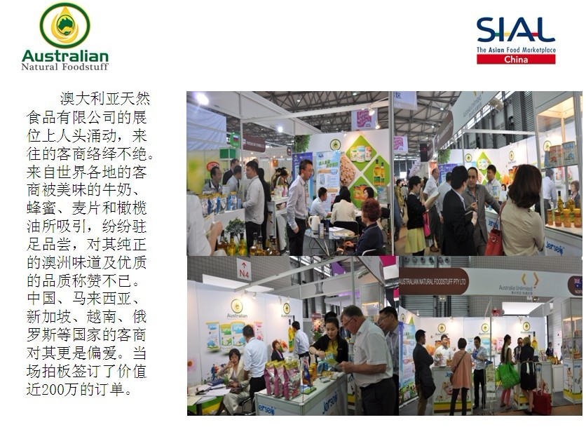 5月7-9日,第十四届中国国际食品和饮料展览会(SIAL China 2013)在上海新国际博览中心举办。澳大利亚天然食品有限公司(Australian Natural Foodstuff Pty Ltd)携其生产的高品质的澳大利亚本土奶粉、橄榄油、蜂蜜、麦片等健康食品闪亮登场。本次展会由法国高爱美博展览集团和(中国)商业发展中心共同主办。九十多个国家和地区2000多企业参展,本次展会是一个高规模的国际性贸易交流平台。